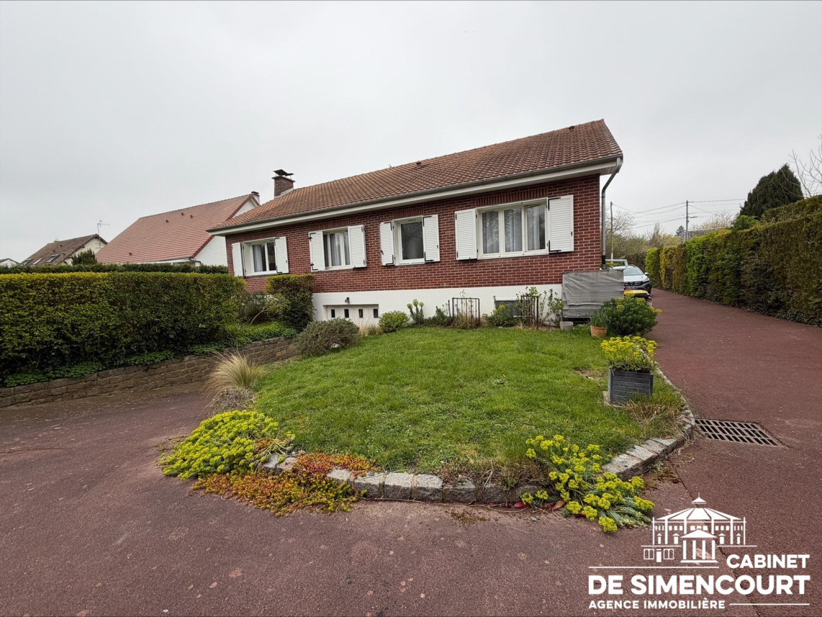 Implantée en retrait de rue, cette maison bénéficie d’un environnement calme et verdoyant.